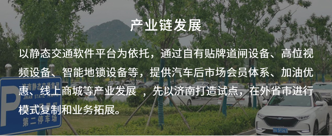 以靜態(tài)交通軟件平臺為依托,通過自有貼牌道閘設(shè)備、高位視頻設(shè)備、智能地鎖設(shè)備等,提供汽車后市場會員體系、加油優(yōu)惠、線上商城等產(chǎn)業(yè)發(fā)展 , 先以濟南 打造試點,在外省市進行模式復(fù)制和業(yè)務(wù)拓展。